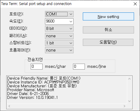 아래는 Teraterm 의 설정 예시입니다. 포트 번호, 속도, 데이터, 패리티비트, 스탑비트, 흐름제어를 선택할 수 있습니다.